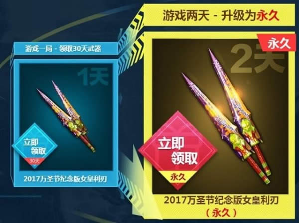 任意游戏一局,累计一天就可领取30天期限武器,累计两天直接升级为永久