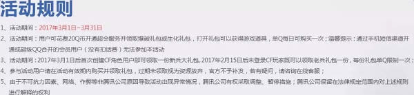 活动期间:2017年3月1日后首次创建CF角色用户即可领取一份新手大礼包,2017年2月15日后未登录CF玩家即可领取老兵礼包一份,没份礼包单Q限制一次。