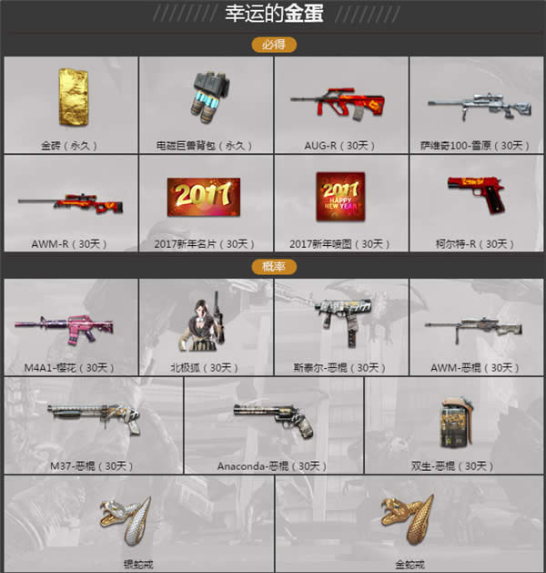 2017CF有枪任性激爽赢新春活动正式开启了!活动期间,玩家登陆CF有枪任性激爽赢新春活动网址即可直接领取新春大礼包!每天加入一局游戏还可砸开1个金蛋,绿钻会员各种道具等你来拿!赶快来参加2017CF有枪任性激爽赢新春活动吧!