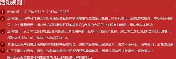 活动期间:2017年2月1日后首次创建CF角色用户即可领取一份新兵大礼包,2017年1月18日后未登录CF玩家即可领取老兵礼包一份,每份礼包单Q限制一次。