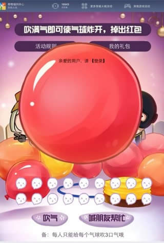 在吹气球活动中,有红色、蓝色、黄色、橙色等不同颜色的气球可供玩家选择,不同颜色的气球吹爆难度有所区别,即需要吹气达3次、6次、9次、12次、18次才能使对应颜色的气球爆炸。每人每天可对多个气球进行吹气,但每个气球仅可吹气3次。值得一提的是,气球仅当日有效,对于需吹气次数多的气球,玩家需邀请好友助力,以获得该气球对应掉落的红包奖励。