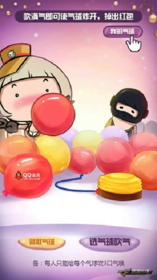 2017cf穿越火线春节吹气球活动正式开启了!玩家需要用手机登陆cf春节吹气球活动页面,cf玩家每天可领取1个气球,吹爆气球即可获得春节礼包!自己吹或者朋友吹都可以哦,赶快叫上你的队友一起来参加cf春节吹气球活动吧!
