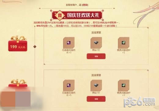 活动期间充值DNF达到对应额度(以折扣后实际扣款为准),即可在4档礼包中领取其一,单帐号仅限一次。(即充值799元,可以在199、399和799里面选择一个进行领取)