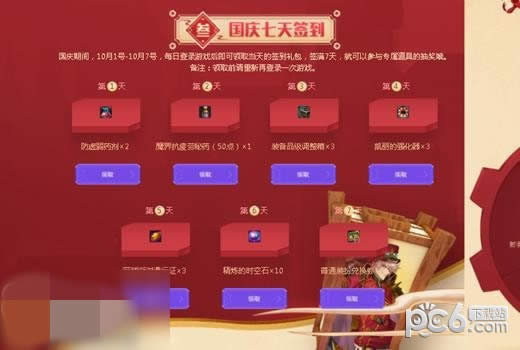 国庆期间,10月1号-10月7号,每日登录游戏后即可领取当天的签到礼包,签满7天,就可以参与专属道具的抽奖哦。