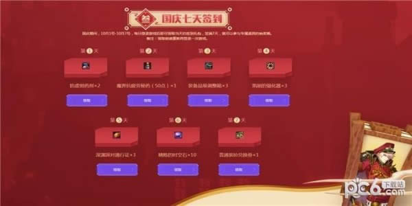 3.国庆期间,10月1号-10月7号,每日登录游戏后即可领取当天的签到礼包,签满7天,就可以参与专属道具的抽奖哦。备注:领取前请重新再登录一次游戏。