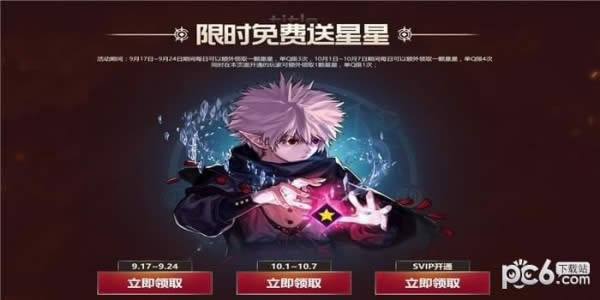 【4】活动四免费领取星星兑换奖励道具大礼,9月在线送礼包,疲劳药、三倍药、契约、番薯,签到10天送30天黑钻