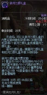 打开中秋节自选礼袋,获得的黄金品级调整箱(Lv85武器)为帐号绑定道具,将于2018年10月2日06:00删除;装备品级调整箱为不可交易道具,无删除时间。