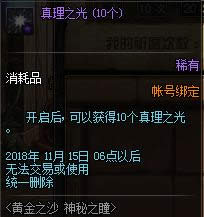 3.活动期间,可以使用【真理之光】在赛丽亚房间内的NPC探险迷妹处兑换奖励。以上道具奖励除【洞悉之眼】为无法交易且无删除日期外,其他道具奖励均为帐号绑定且将于2018年11月15日更新维护后统一删除,请及时使用。账号购买限制将于每周四06点后重置。