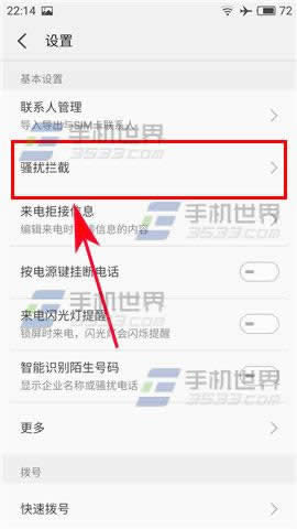 1)打开电话拨号界面,点击右上角的三个小点按钮,选择【设置】,进入电话设置界面,再选择【骚扰拦截】选项。(如下图)