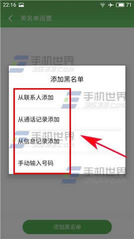 3)点击下方的【添加黑名单】按钮,然后就可以根据自己需要选择添加方式添加号码就可以了。(如下图)