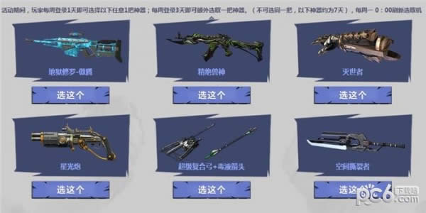 活动期间,玩家每周登录1天即可选择以下任意1把神器;每周登录3天即可额外选取一把神器。(不可选同一把,以下神器均为7天),每周一 0:00刷新选取机