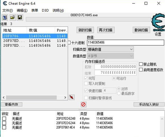 再打开nms,让自己的钱变化一下,如变成6250。再一次转到CE,输6250,点击再次扫描。这时只会出现三个数据(若是很多请在继续进行这一步)。