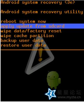 5:手机在关机状态下,插入SD卡,同时按住手机的音量上键 + 开关机键不要松手,过一会手机进入recovery模式。